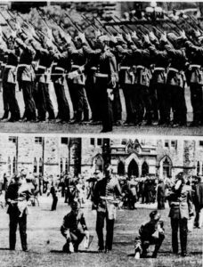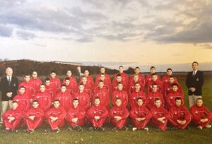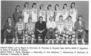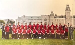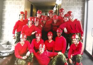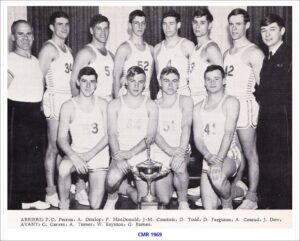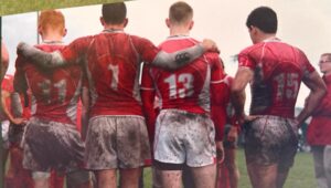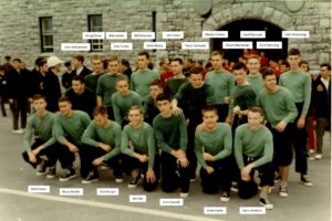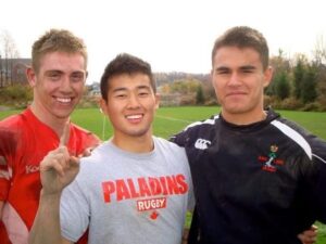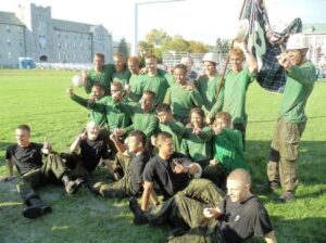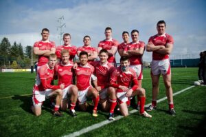 RMC Rugby competing at the Rugby Canada National Invitational University Sevens Tournament in Victoria, BC, 2012. (From Left to Right) Top Row: Rhys Davis, Eric Young, Brandon Black, Kellan Moore, Josh Kim, Chris Pratt, Matt Taylor. Bottom Row: Colin Carswell, Rick Spiller, Jaemok Lee, Riley Saliken, Spencer McLeod.