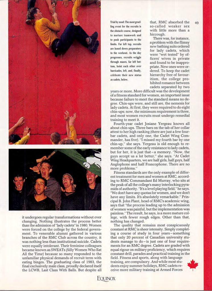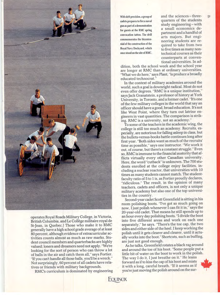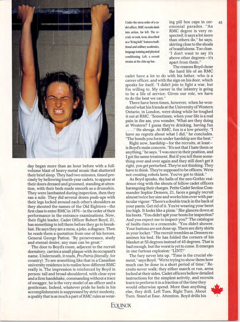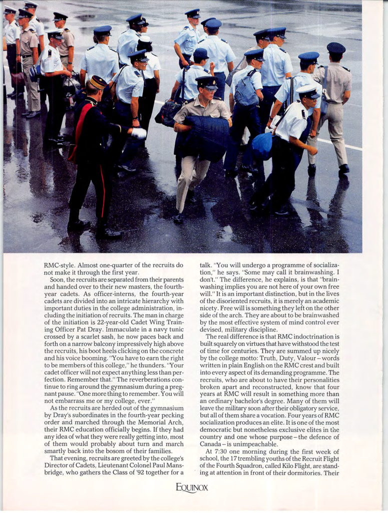 Originally published in Equinox magazine in 1989, this article offers a vivid, immersive look into life at the Royal Military College of Canada during a period of significant cultural and institutional change. Through rich storytelling and powerful photography, it follows new cadets as they navigate the pressures, traditions, and transformations that shape their earliest days at RMC. From the intensity of Recruit Term and the discipline of military training, to the camaraderie, academic expectations, and evolving environment of the College, the piece captures RMC at a moment when old rituals were being re-examined and a new generation of cadets was learning what it meant to pursue Truth, Duty, Valour.